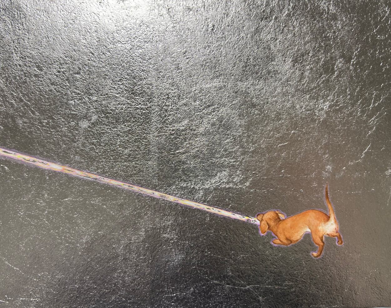 仕様: ⽊製パネル / ⿇紙 / 樹脂膠 / アルミ箔 / ⽔⼲絵具 / アクリル